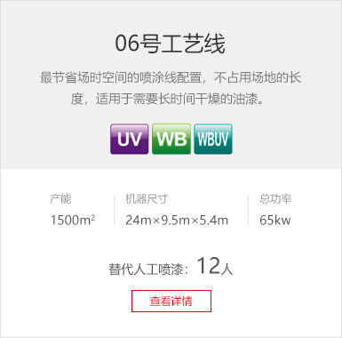 工艺要求 环保PU底漆、PU面漆 产品种类 实木复合门 产线数量 4条 设备特色 带回收的环保PU漆及立体干燥房,门扇双面喷漆+立体干燥。 生产产能 600套/天 废气处理 干式过滤+催化燃烧处理系统 -